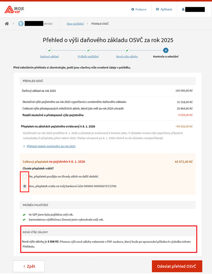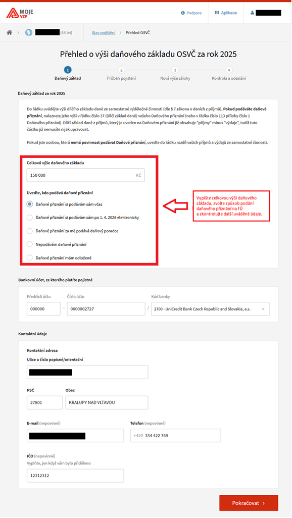 Aplikace vás celým procesem provede a sama ze systému VZP načte do formuláře většinu potřebných dat (např. úhrn zaplacených záloh, dobu pojištění). Doplníte pouze výši daňového základu a způsob podání daňového přiznání.
