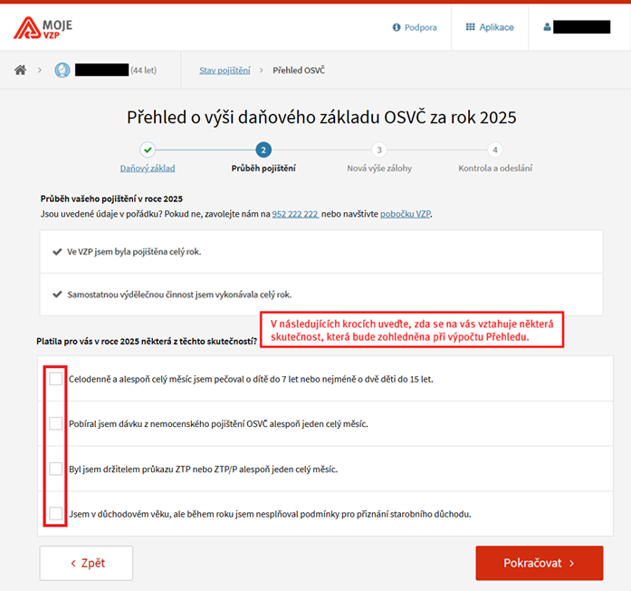 Jestliže jste přihlášeni do webové aplikace Moje VZP, vyplníte Přehled OSVČ snadno a rychle ve čtyřech krocích.