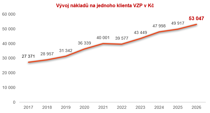 Všeobecná zdravotní pojišťovna má pro rok 2026 připraveno na zdravotní péči v průměru na každého svého klienta 53 047 korun. Částka poprvé v historii přesahuje 50 tisíc. Před 10 lety se jednalo o sumu zhruba poloviční (27 371 korun). Od počátku novodobé historie pojišťovny, tedy od roku 1992, průměrné roční náklady na pacienta narostly 17krát.